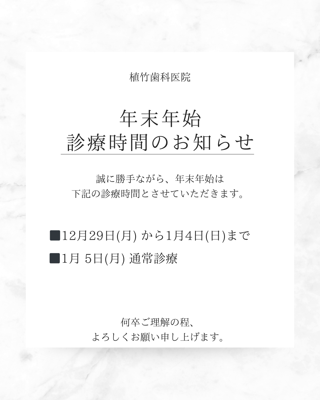 12月27日(水)~1月4日(木)まで休診させていただきます。